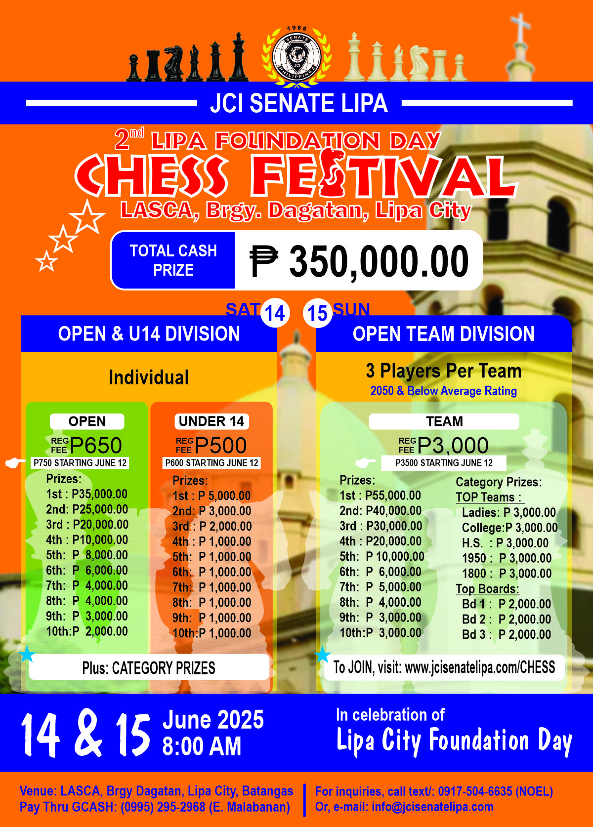 JCI Senate Lipa is proud and excited to welcome you back for another thrilling chess experience! Building on the fantastic success of our inaugural event, we invite the chess community to join us for the 2nd (JCI Senate Lipa) “Lipa Foundation Day Chess Festival” chess festivities, held once again in celebration of Lipa City’s Foundation Day.